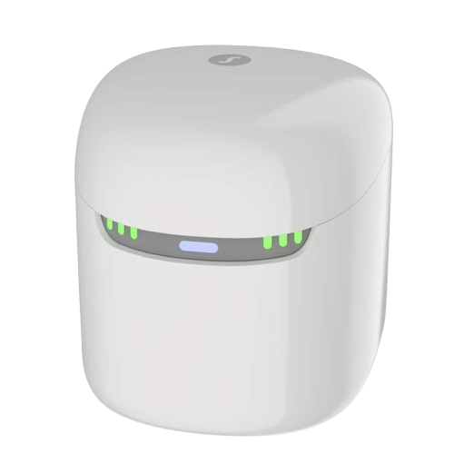 Designed for select Pure, Styletto, and Motion Charge&Go models, the Dry&Clean Chargers combine fast, efficient charging with built-in UVC cleaning and drying technology to maintain optimal hearing aid performance. Cleaning begins automatically upon placement and completes in just 15 minutes. Three LED indicators per hearing aid show charging progress, while an additional light confirms cleaning status—all enclosed within a protective lid for safe storage.