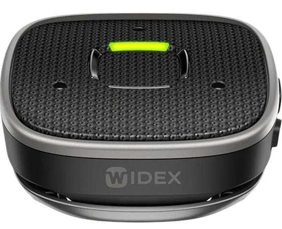 Widex Sound Assist™ is a compact, multi-functional accessory that enhances communication and connectivity for Widex Moment Bluetooth hearing aids. It functions as a partner mic, table mic, hands-free phone device, Bluetooth streamer, and remote control—all in one. Designed for everyday ease, it helps users hear more clearly in conversations, group settings, and while streaming audio.